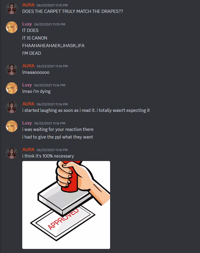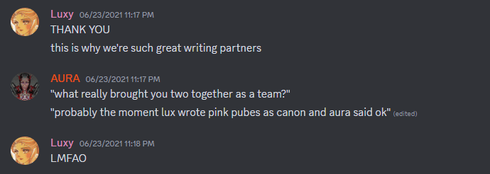 Lux: HAHAHA. Ohh my god, this was totally a pivotal moment. For me, I think it was Aura generally being so supportive of me and my writing. There were times when I sent over a draft and I was so nervous, like she’s going to think I’m weird! But then she loved it, and it made me feel both more confident in myself and also more comfortable in my working relationship with her.