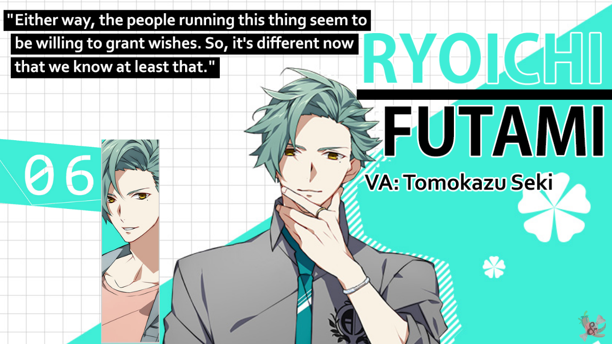 Ryoichi Futami: The older man. A college student who is charismatic and aims to be the caring big brother of the group. If you have a problem, go to him, he’ll help you though it. It’s probably the artist in him talking, but the way he speaks has such a romantic ring to it.